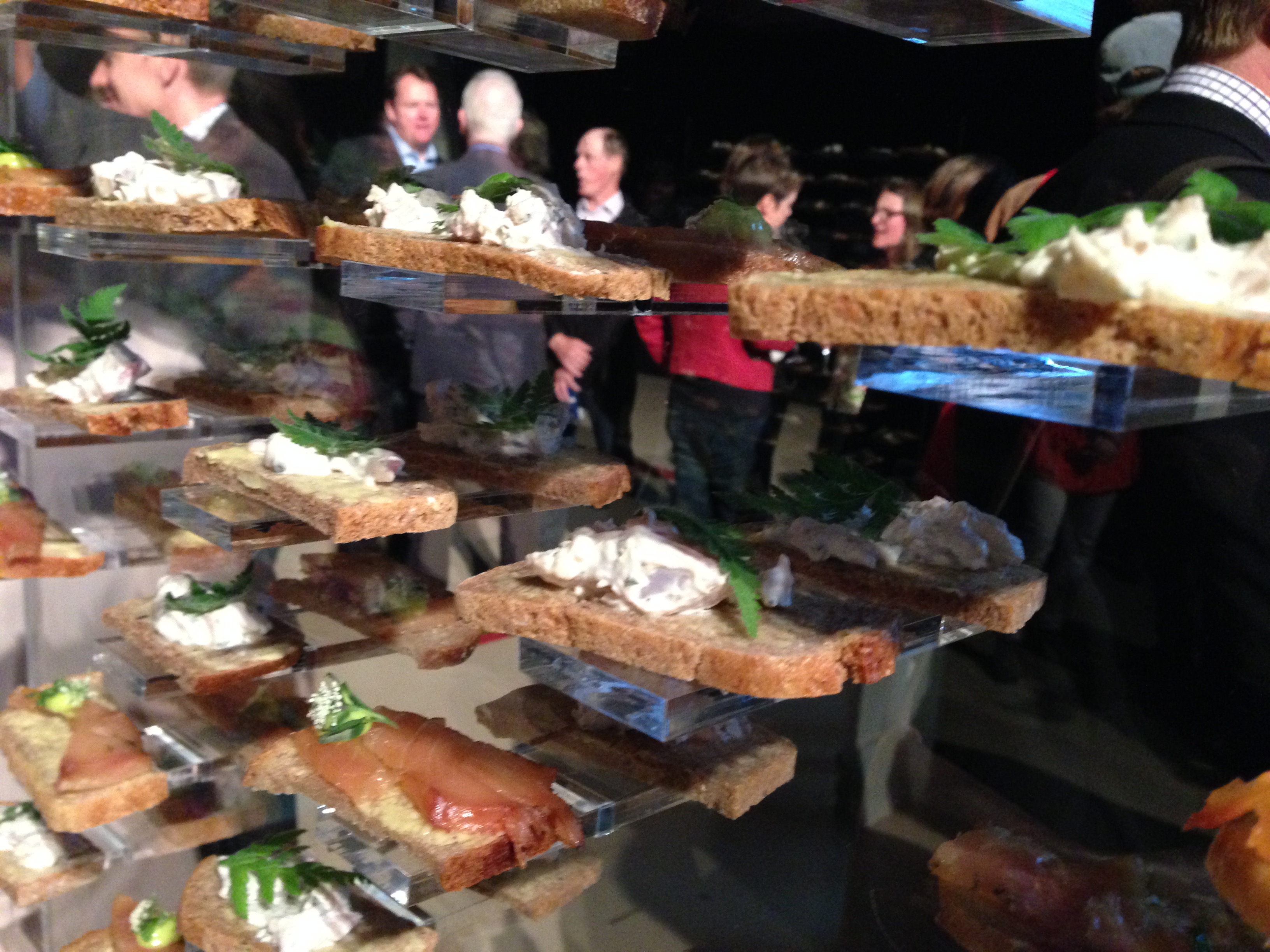 Förrätt som montrar under mingel, en kul idé för att lära känna olika människor. Där fanns det både munsbitar av lufttorkad skinka, rensalami med majrova, spickekorv och som här nedan på bild i genomskinlig vägg med inlagd gösröra och gravrökt vildlax på bröd. Till serverades läckra nektar på älgört, lingon och äpple.